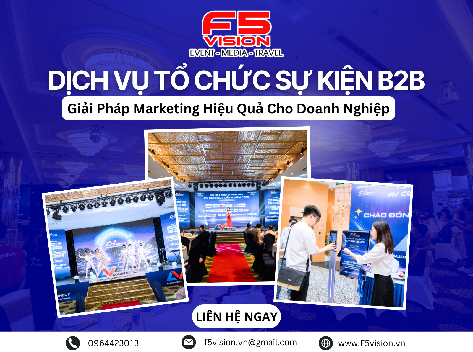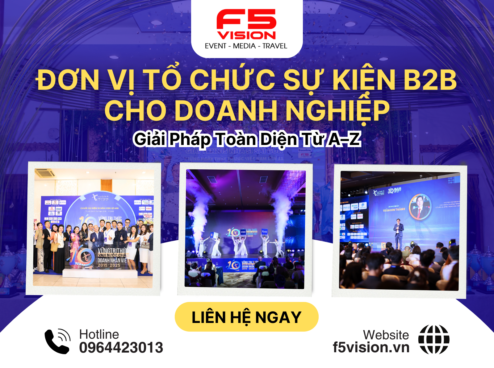Tuy nhiên, để một sự kiện B2B thành công không đơn giản là dựng sân khấu hay mời khách tham dự, mà đòi hỏi một quy trình bài bản, chiến lược rõ ràng và sự phối hợp chặt chẽ giữa nhiều hạng mục. Chính vì vậy, việc lựa chọn một đơn vị tổ chức sự kiện B2B chuyên nghiệp chính là giải pháp tối ưu giúp doanh nghiệp tiết kiệm chi phí, tối đa hiệu quả và nâng tầm thương hiệu. Với hơn 9 năm kinh nghiệm trong ổ chức sự kiện, F5VISION hiện có dịch vụ Dịch Vụ Tổ Chức Sự Kiện B2B trọn gói chuyên nghiệp, sáng tạo và hiệu quả, với báo giá minh bạch – tối ưu ngân sách cho từng nhu cầu.