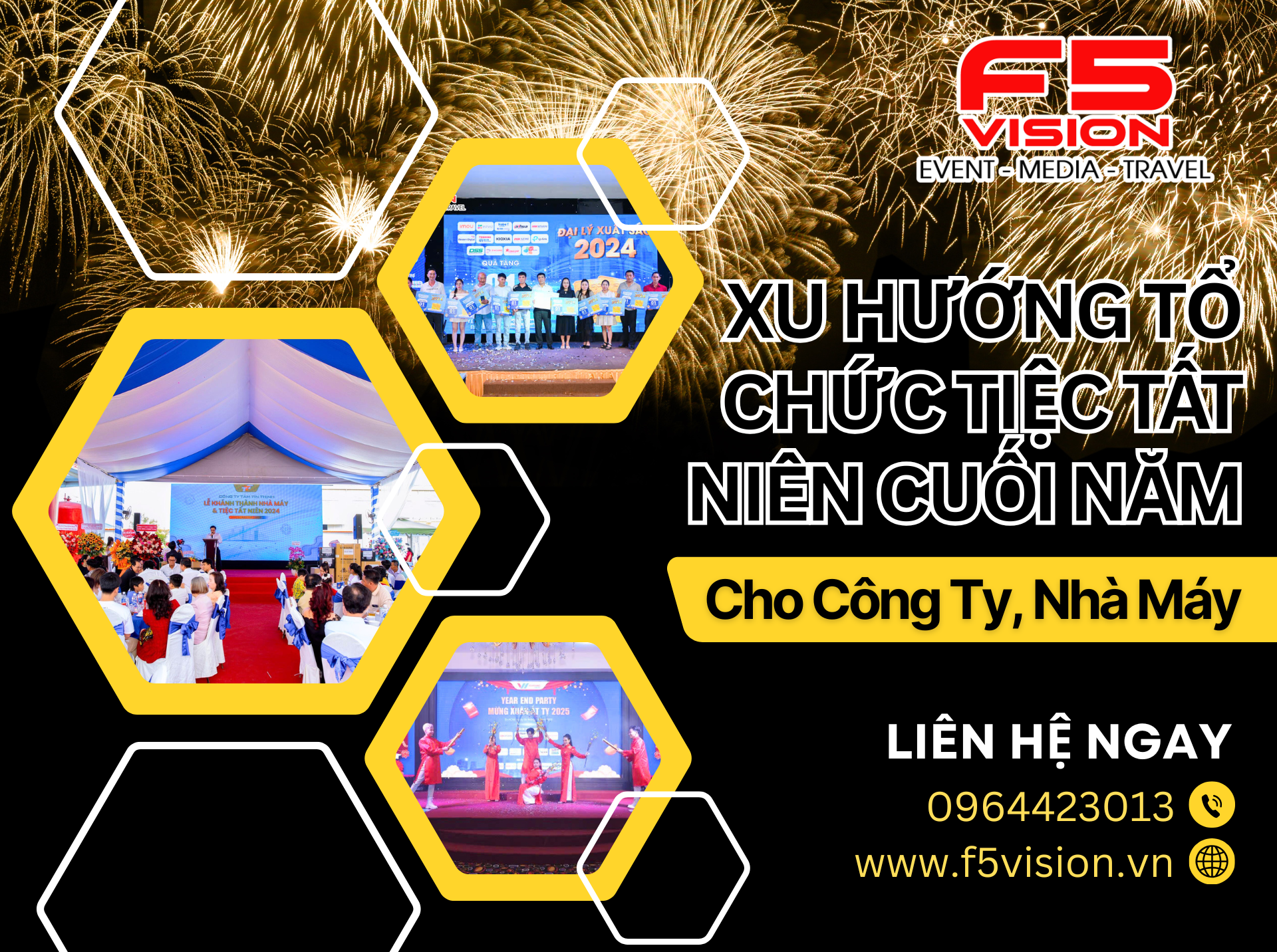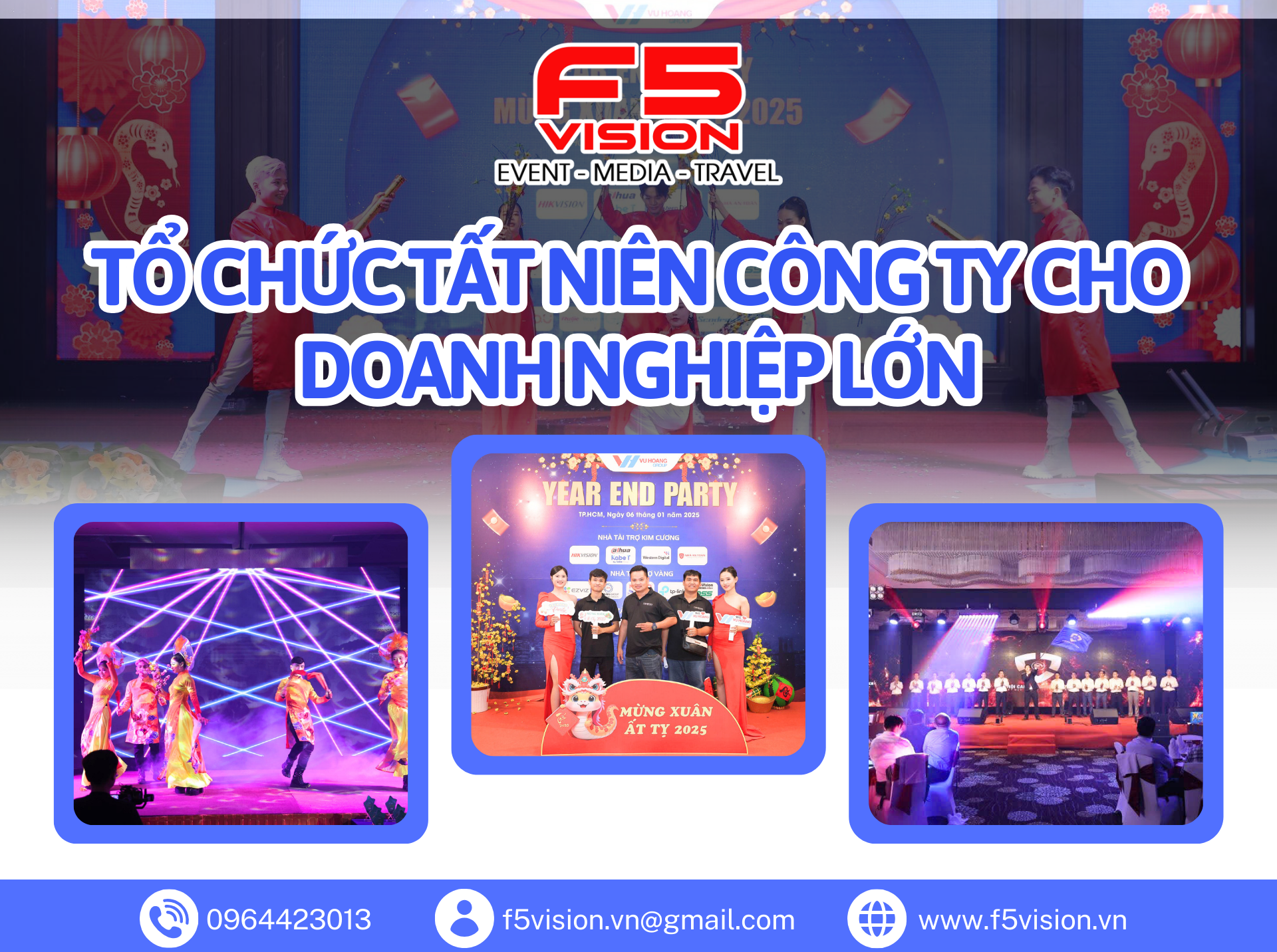 Ở nhóm doanh nghiệp lớn, việc tổ chức tất niên đòi hỏi đầu tư bài bản, quy trình chuyên nghiệp, khả năng quản lý hàng loạt hạng mục phức tạp. Chính vì vậy, nhu cầu tìm kiếm một đơn vị tổ chức sự kiện chuyên nghiệp ngày càng tăng mạnh, nhằm đảm bảo chương trình vừa hoành tráng, vừa mang dấu ấn riêng của doanh nghiệp. Với hơn 8 năm kinh nghiệp trong ngành, đã tổ chức nhiều sự kiện tất niên với đủ loại quy mô cho các doanh nghiệp, F5VISION chắc chắn sẽ mang đến cho bạn buổi tiệc tất niên ấn tượng, hấp dẫn với mức phi phí phải chăng phù hợp với ngân sách của doanh nghiệp.